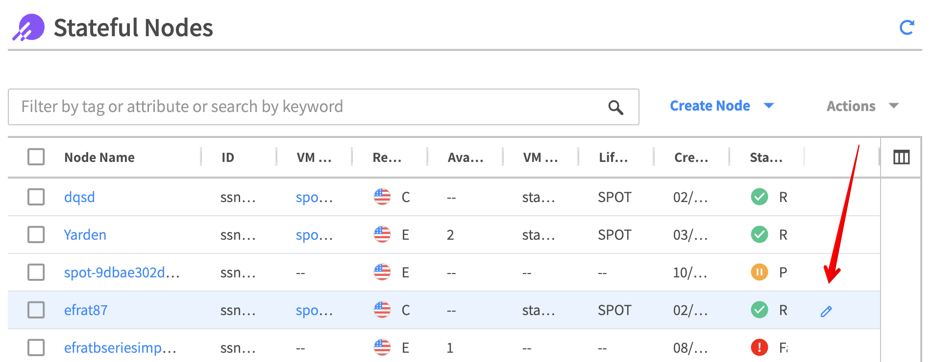 The list of stateful nodes gives you a quick view of your nodes and basic information, including: